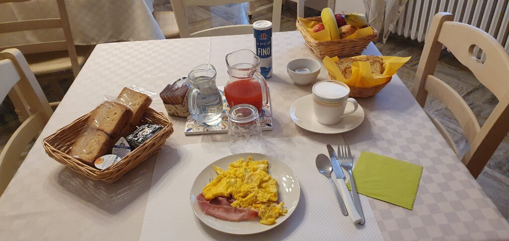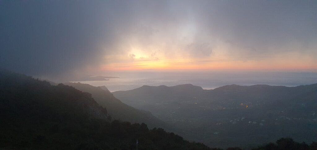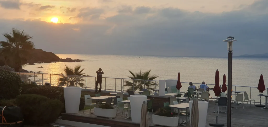 Gestartet wird wie immer mit einem guten Frühstück. Und wie ihr seht, war die Fähre noch da und Knecht Ruprecht ordentlich an das Schiff gebondaged. Abgeschlossen wurde die Fahrt mit einem schönen Sonnenuntergang am Col du Teghime.